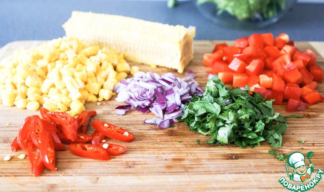 Срезать с кукурузного початка зерна. Лук и сладкий перец нарезать на мелкие кубики, измельчить кинзу. Перчик чили нарезать под косым углом на тонкие кольца.