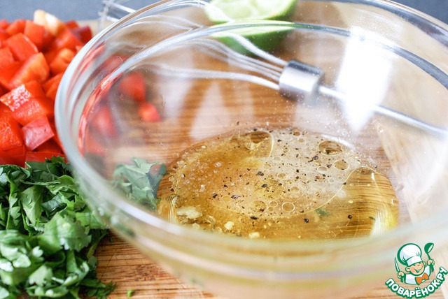 Взбить вместе оливковое масло, уксус и сок оставшейся половины лайма со щепоткой соли и перца.