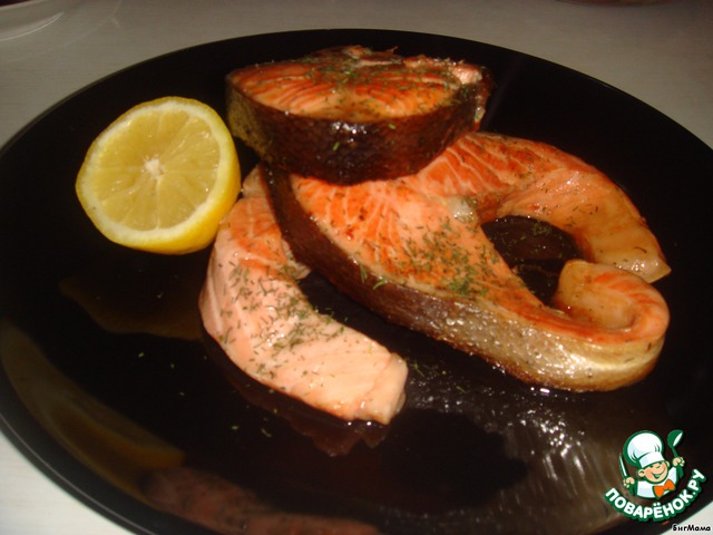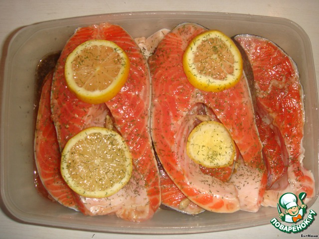3. Переднюю часть рыбы режем на медальоны. Заливаем соевым соусом.