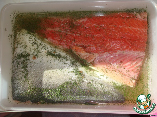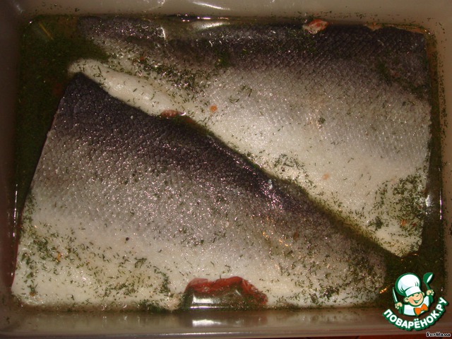 6. Готовую заправку выливаем в контейнер, где будет мариноваться форель. Помещаем рыбу в контейнер с заправкой шкурой вниз. Шкуру равномерно присыпаем небольшим количеством соли. Отправляем в холодильник, желательно на всю ночь. Периодически встряхивая контейнер.