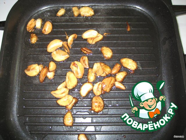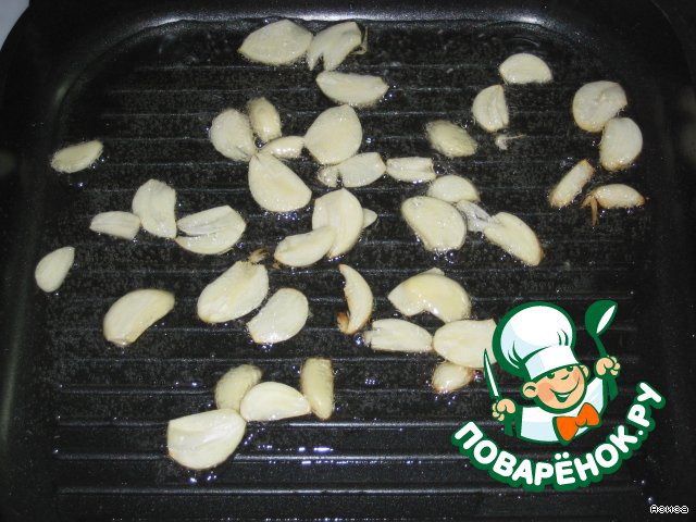 Очищенные зубчики чеснока порежьте вдоль на пластинки, и нагрев на сковороде масло закидывайте его туда.