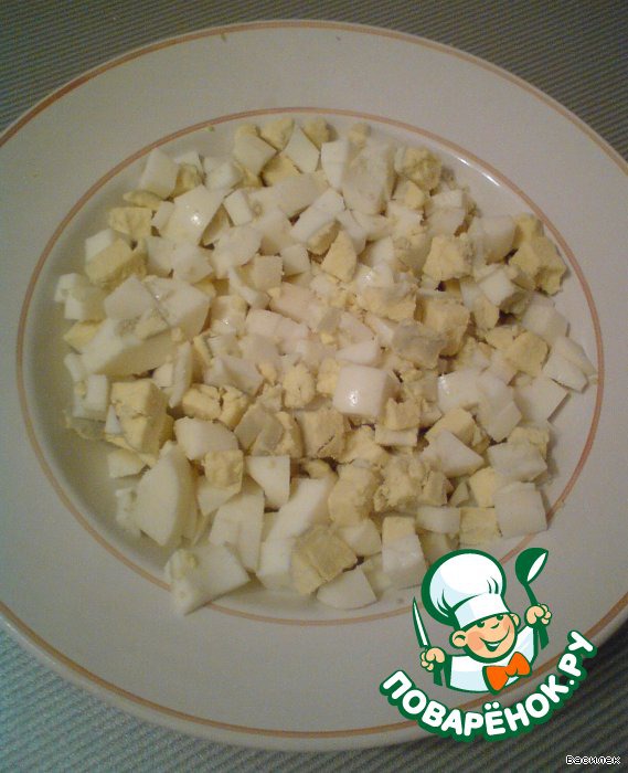 3 яйца сварить, остудить и нарезать небольшими кусочками. 1 яйцо оставить сырым.