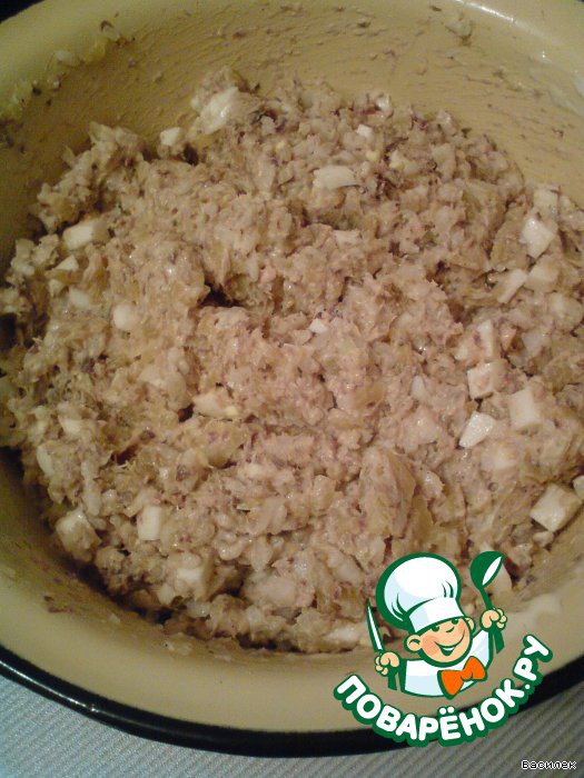 Рис, рыбу, вареные яйца, картошку, лук, смешиваем. Добавляем сырое яйцо, 2ст ложки майонеза, солим, перчим по вкусу. Все хорошенечко перемешиваем.