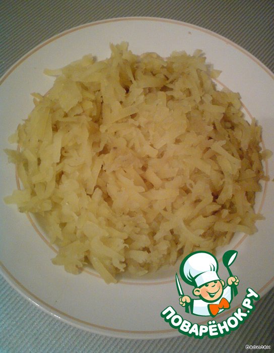 Картошку сварить в мундире, остудить, очистить и натереть на крупной терке.