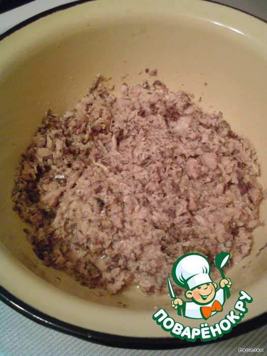 Консервы вместе с маслом разминаем вилкой до образования однородной массы.