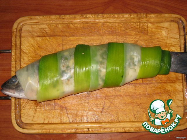 Отделяем несколько листков лука и режем по волокну.. немного отвариваем, чтобы лук стал мягким. Когда лук остынет, обвернем им нашу рыбку, положим на противень и в духовку.