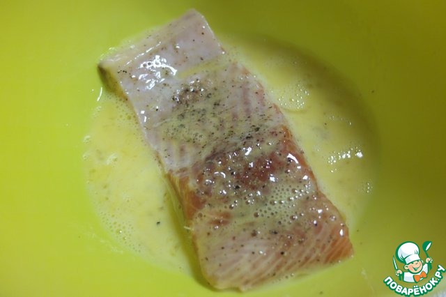 В отдельной миске слегка взбиваем вилкой яйцо. Филе опускаем в яйцо