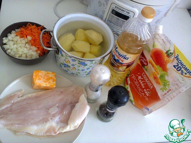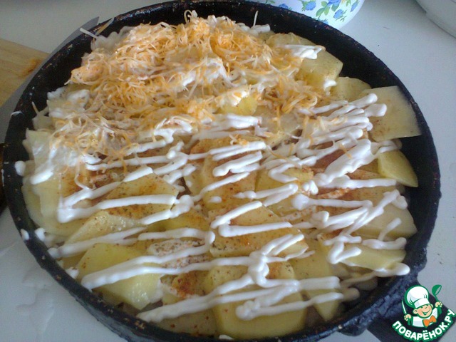 8. И теперь сверху эту рыбку покрываем слоем тонко нарезанных кружочков картофеля, солим, перчим, можно добавить приправы по вкусу и делаем майонезную сетку.