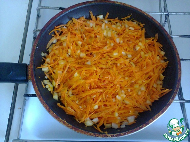 2. В сковороде спассеровать лук с морковкой с добавлением небольшого количества подсолнечного или оливкового масла.