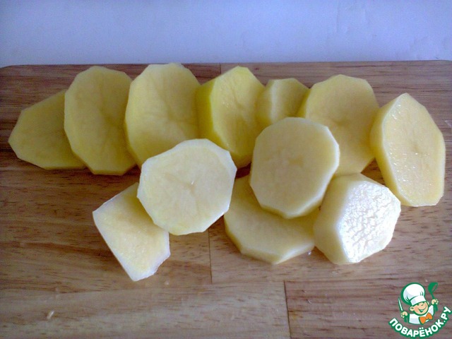 3. Пока овощи пассеруются: 4 картофелины нарезаем кружочками по 0.5 см толщиной, и 1 картошку режем очень тонкими кружочками, толщиной 0.2 - 0.3 см.,