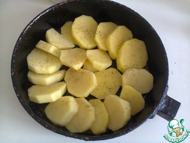 Первый слой картофель, нарезанный кусочками потолще. Солим и перчим его.