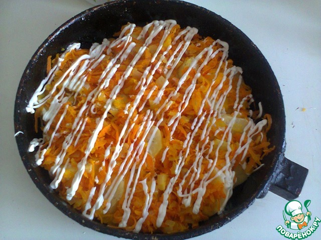 6. Вторым слоем выкладываем спассерованные овощи, немного солим и перчим, сверху делаем майонезную сетку.