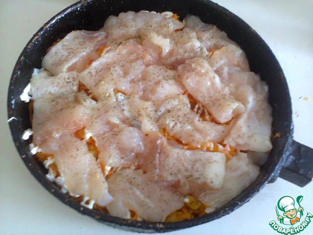 7. Следующим слоем выкладываем рыбку. И снова немного соли и перца.