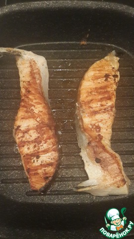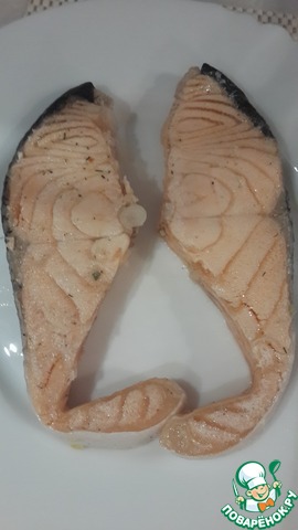 Так как в силу понятных причин не все наши домочадцы любят паровую рыбку, второй стейк я обжарила на сковороде-гриль бе3 масла по 5 мин. с каждой стороны. На этом этапе я обычно солю стейки.
