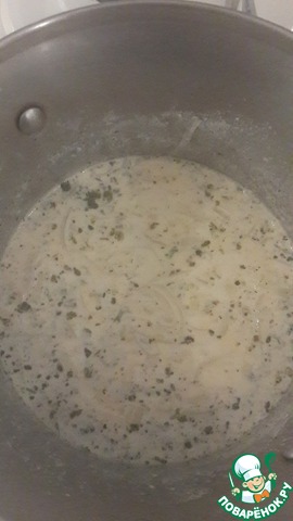 Бульон в котором варился лосось, доводим до кипения и увариваем 5-10 минут до 3агустения. Вливаем вино. Добавляем сливки.