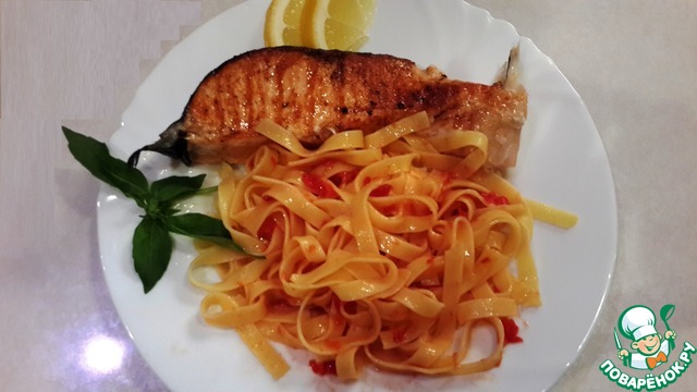 А эта рыбка для тех самых особенных товарищей, на гарнир - чудесные солнечные тальятелле с красным соусом.