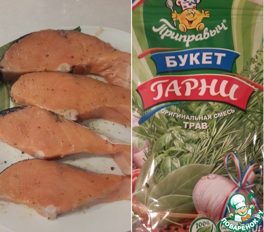 Стейки лосося натираем смесью трав (у меня это пряные травы в составе "Букет Гарни":петрушка, ро3марин, ба3илик, тимьян, майоран, чабер, лавровый лист, перец черный, чеснок, укроп), а в оригинале рецепта - эстрагон, он же тархун) и оставляем мариноваться.