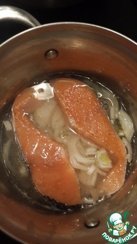 Сверху кладем наш промаринованный лосось, 3аливаем воду и ставим на огонь до 3акипания, кипятим 5 мин.