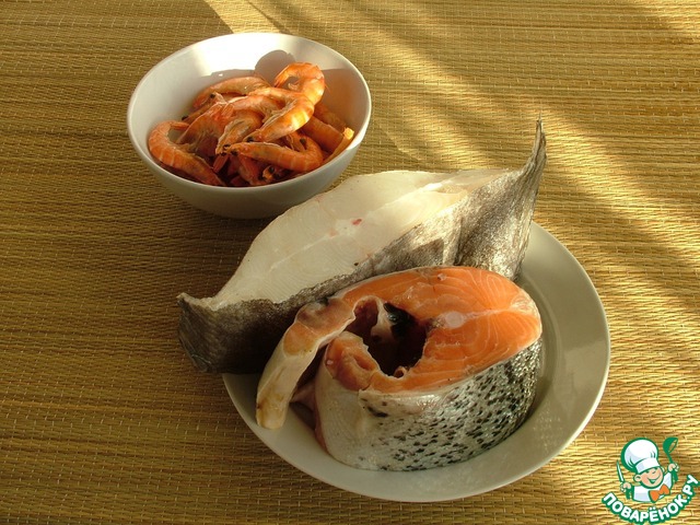 Разделала рыбу на филе и нарезала кусочками примерно по 3-4 см. Креветки почистила, оставив хвостики.