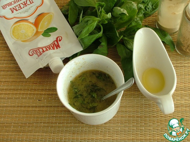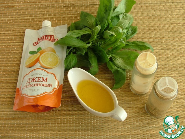 Для маринада я использовала апельсиновый джем Махеев, растопленное сливочное масло, мелконарубленный базилик, перец и имбирь. Если готовить шашлычок в духовке или на простой сковороде, то сливочное масло - лучше всего. Но если использовать сковороду-гриль, то я бы всё же взяла оливковое мало - 1-2 ложки.