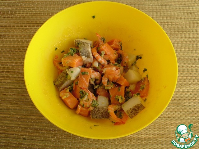 И перемешиваем с подготовленной рыбой и креветками. скорее всего сливочное масло свернется от невысокой температуры рыбы, но в этом нет ничего страшного. При запекании масло растает, и, смешанное с другими ингредиентами, будет источать необыкновенный аромат. Оставляем рыбку мариноваться в прохладном месте до 12 часов, периодически перемешиваем.