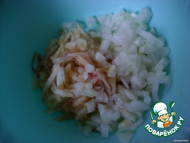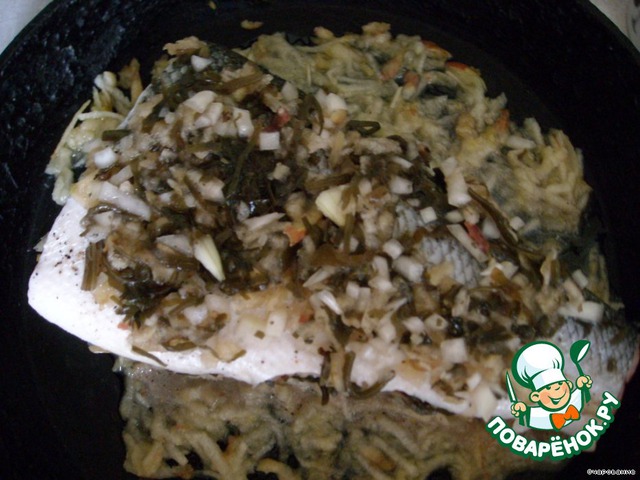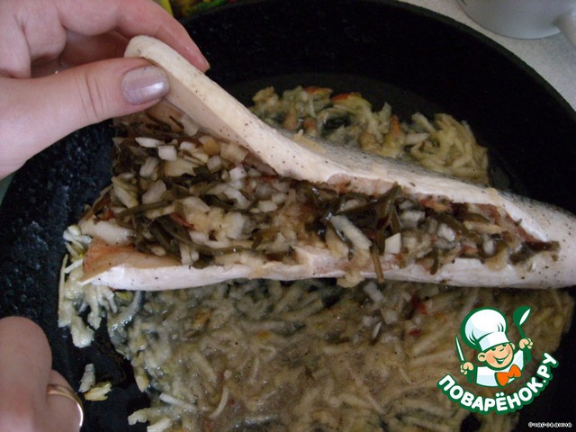 На дно сковроды положить натертое яблочко, уложить рыбку, остатки начинки выложить на рыбу, и запекать по 30 минут на каждой стороне.