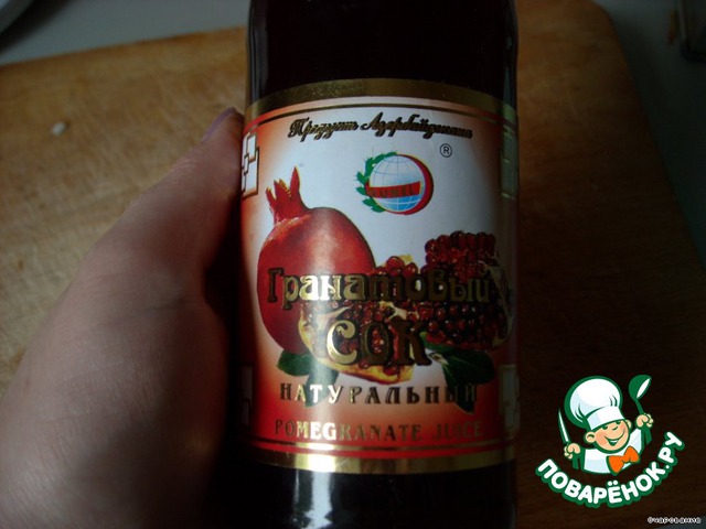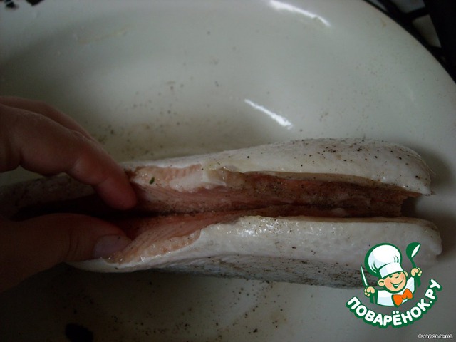 Семгу распороть, посолить, поперчить, и с помощью щприца ввести в рыбу сок гранатовый (несколько раз на одной стороне в разные места, и на другой)