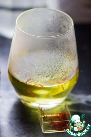 Рыбу обжарить на сковороде по 3-4 минуты с каждой стороны до румяной корочки. Затем добавить крупно порезанный зеленый лук, обжарить слегка и влить шафранную воду.