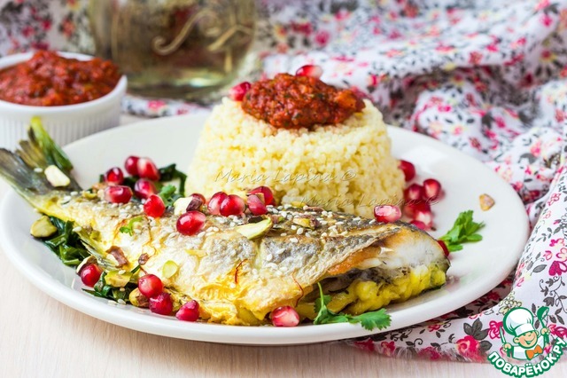 | Этот рецепт привлек меня своим необычным сочетанием. Рыба получается очень вкусной, с легким шафрано-луковым соусом. В дополнение к ней прекрасно подойдет пшено, а к пшену необычный соус с перцами, кинзой и курагой. Блюдо получается очень богатым, множество разных текстур и вкусов сплетаются в единую картину. Рекомендую тем, кто хочет найти для себя новые сочетания. |