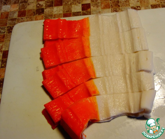 Крабовые палочки разворачиваем и разрезаем на широкие полоски.