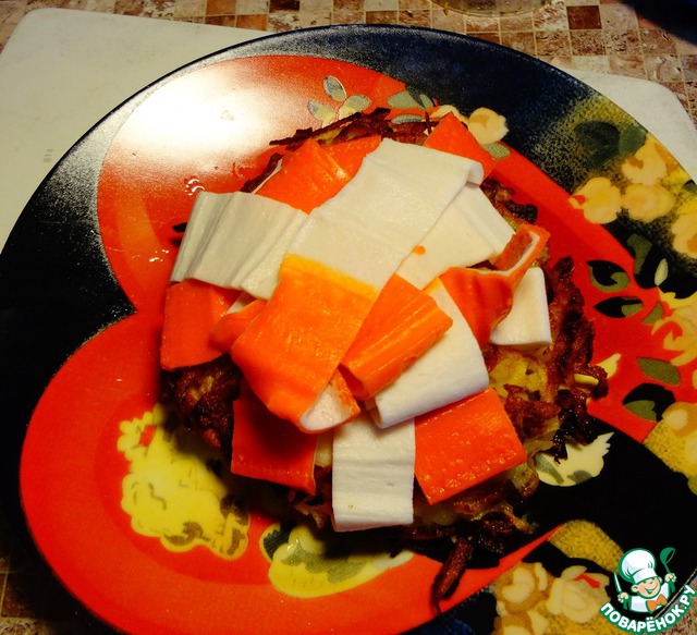 Положить на жаропрочную тарелку рости, сверху живописно уложить на него полоски из крабовых палочек.
