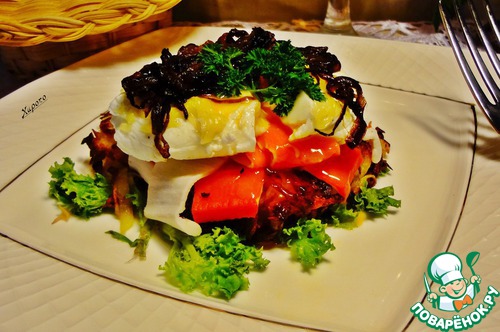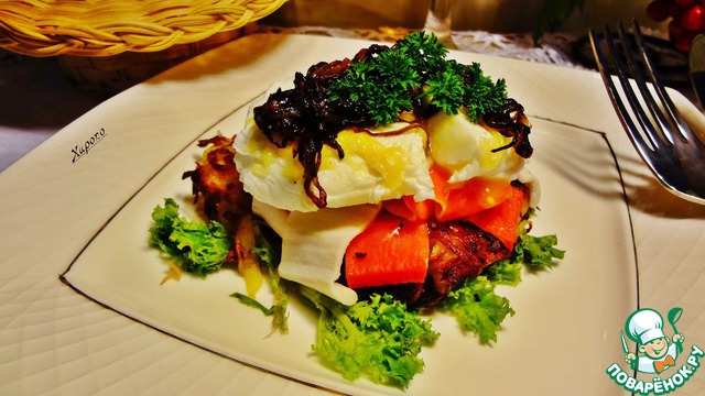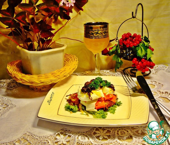 Перед подачей нашего блюда к столу не забудьте надрезать яйцо-пашот, чтобы желток аппетитно вылился наружу.