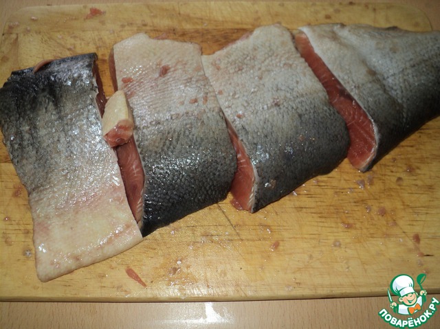Свежую кету разделать на филе с кожей без костей (можно использовать готовое). Филе нарезаем на порционные кусочки. Готового филе у меня получилось 1кг.
