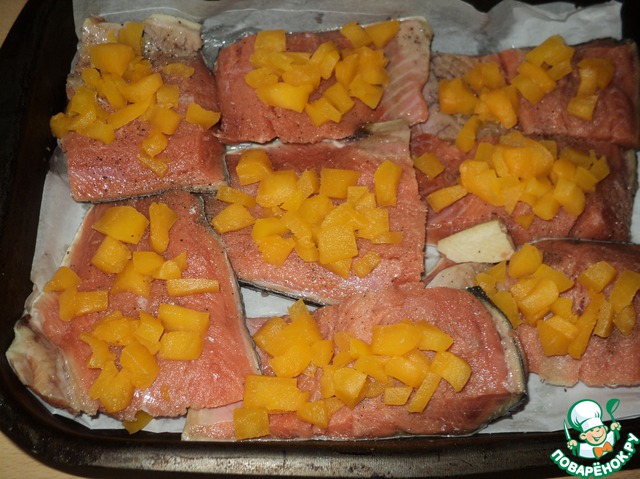 Рыбу солим, перчим и выкладываем в форму. Очищенную тыкву мелко режем кубиком и выкладываем сверху кеты.