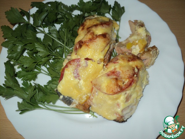 Поливаем сверху смесью сметаны и майонеза, посыпаем тёртым сыром. Запекаем в духовке около 20 минут при температуре 200 градусов.