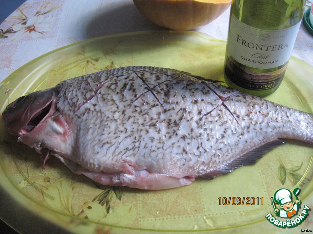 Подготовить рыбу: выпотрошить, снять чешую, удалить жабры, щедро полить белым сухим вином и оставить на некоторое время. Вино можно заменить лимонным соком или соевым соусом, если берете соевый соус, то рыбу потом солить не надо