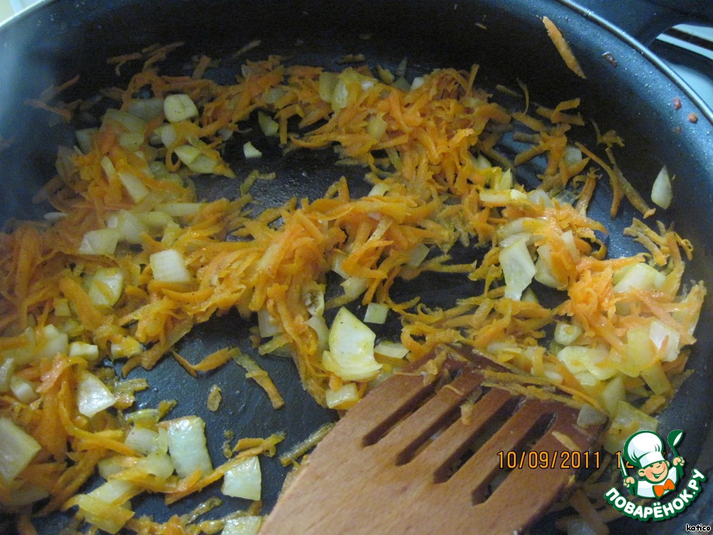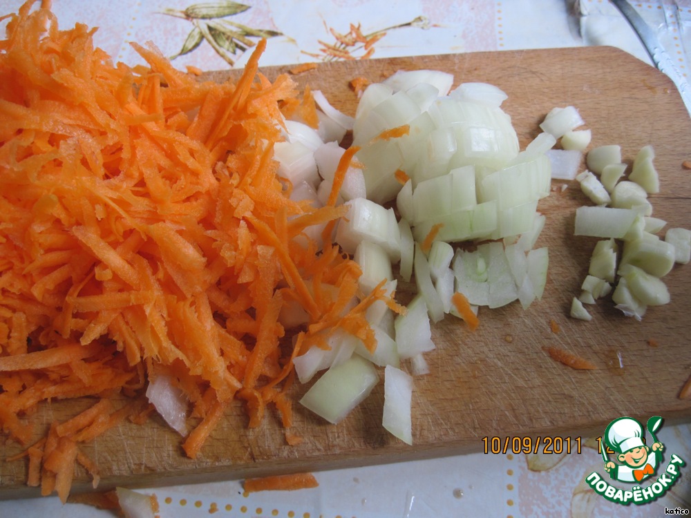 Чеснок порубить, лук нарезать, морковь натереть на крупной терке