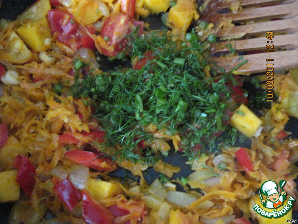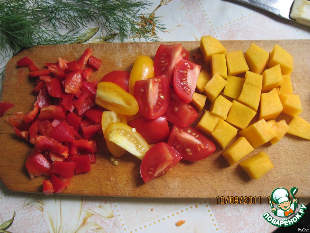 Тыкву, помидоры, сладкий перец нарезать и добавить к овощам, перемешать и снять с огня