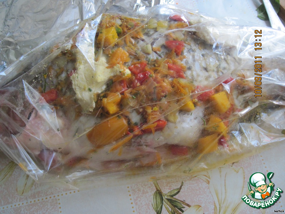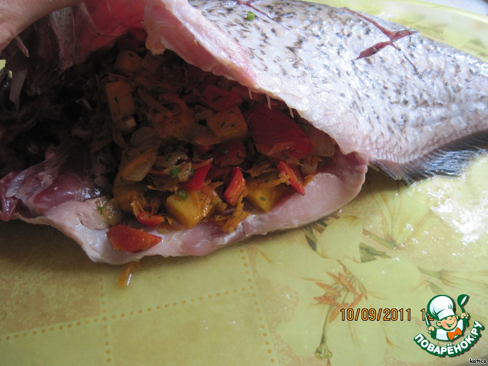 Овощную смесь уложить в брюшко рыбы, немного овощей оставить, чтобы уложить сверху на рыбу