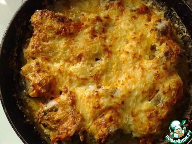 Наверх рыбы сначала кладем зажарку, затем соус. Ставим в духовку 180, на минут 25-30.