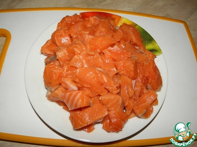 С рыбы снять ножом шкурку ( отложить для бульона!), удалить, если попадутся косточки, и порезать на небольшие кусочки., каплю соли, по желанию. Разогреть в глубокой сковороде растительной масло, и обжарить рыбку в течении 2-3 минут, переложить на тарелку.