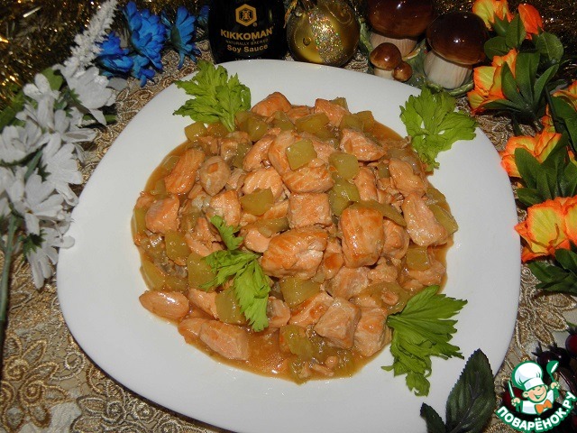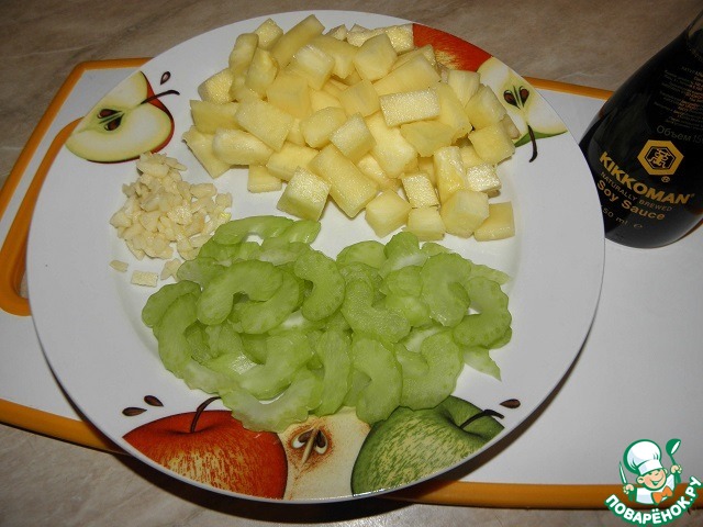 Ананас почистить, нарезать, или размер как рыбу, или чуть меньше., из оставшейся части ананаса, нам еще будет нужно 50 мл сока., сельдерей нарезать ломтиками, или полосками, чеснок мелко порезать.