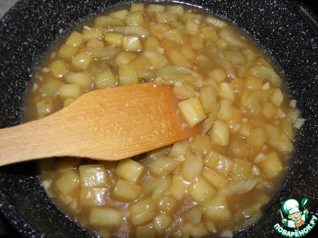 Выложить в разогретую сковороду сельдерей, чеснок и ананас, обжарить минуту, добавить соевый соус, ананасовый сок, влить рыбный бульон, и потушить минуты 4-6. Развести крахмал водой ( если обычный, то 1 ст. л без горки и 2 ст. л воды), если кукурузный, то 1 ст. л. и 2 чл воды, приблизительно.. Влить крахмал в соус. и несколько минут готовить ( пока соус не станет прозрачным и загустеет. Затем вернуть рыбу к соусу, немного прогреть