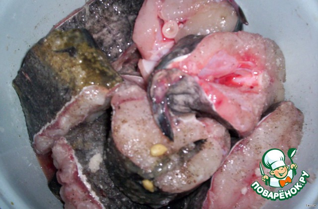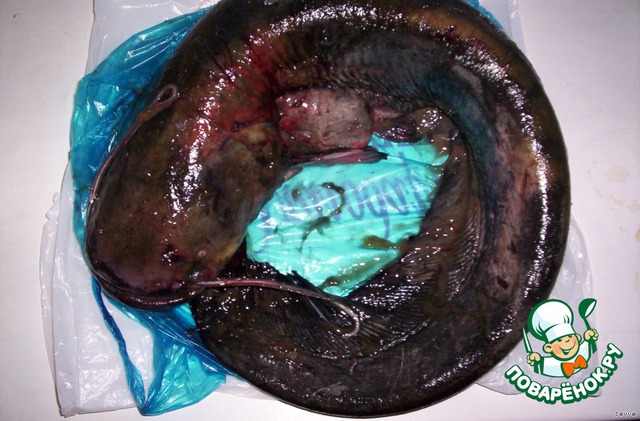 - Отделить от тушки сома голову, отрезать хвост и плавник, сом порезать на порционные кусочки