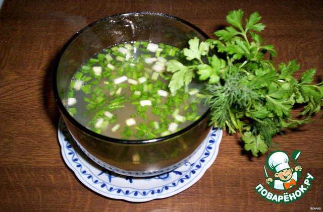- разложить головное мясо в тарелки + картофель + залить жидкостью + зеленый лук