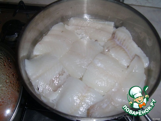 Кладем порезанную рыбу (любую свежемороженую) в нагретое растительное масло. Тушим.