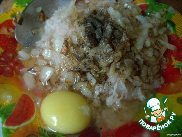 Хек пропустить через мясорубку, добавить лук обжаренный, яйцо, соль, перец, перемешать.
