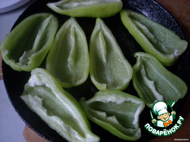 Перчики помыть, разрезать пополам, вынуть семечки, уложить в форму и запечь до мягкости.