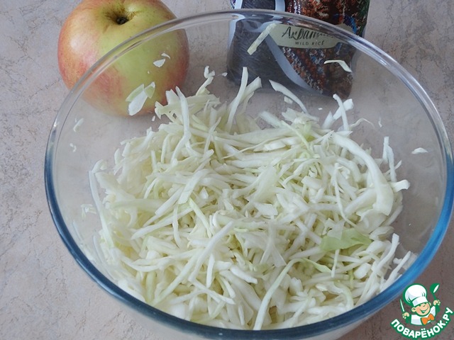 Нашинкуйте капусту. Посолите и помните руками, чтоб капуста дала сок. Натрите яблоко, перемешайте. Можно поперчить.