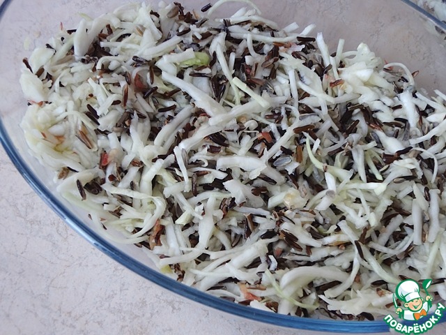 Добавьте вареный рис к смеси капусты и яблока. Яблоко нужно непременно кислое. Если попалось сладковатое, то добавьте немного лимонного сока.